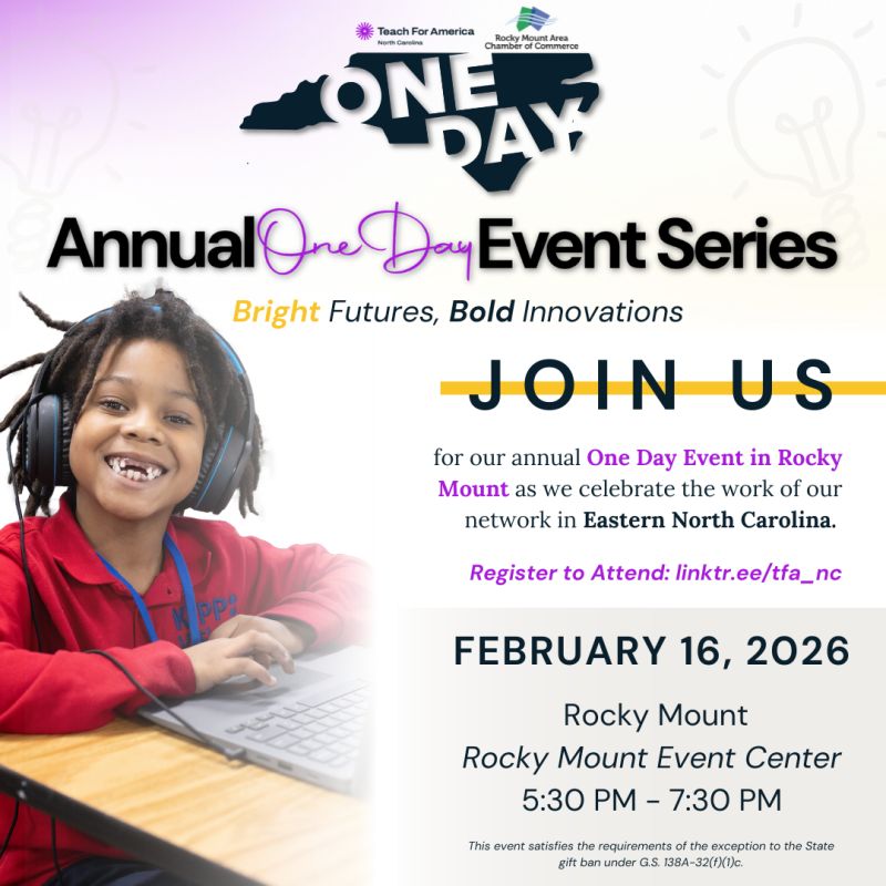 Teach For America North Carolina, in partnership with the Rocky Mount Area Chamber of Commerce, is bringing its “One Day” Event Tour to Rocky Mount for an inspiring evening focused on education, innovation, and opportunity across Eastern North Carolina.