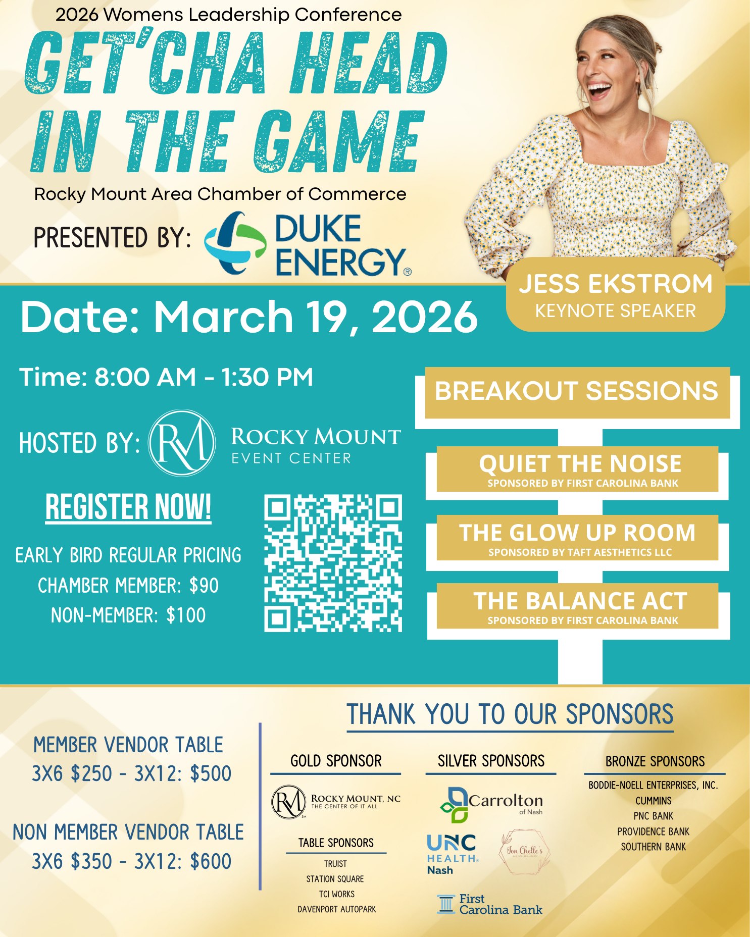 Join the Rocky Mount Area Chamber on March 19 for an inspiring and empowering Women’s Leadership Conference. This year’s event will feature keynote speaker Jess Ekstrom, who will challenge and motivate attendees to embrace new opportunities for growth, innovation, and leadership. Don’t miss this dynamic day of connection, insight, and professional development.